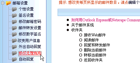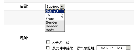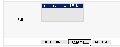 這里以拒收郵件標(biāo)題含"性用品"或者"情趣用品"為例:1> 登錄郵箱進(jìn)入首頁(yè),點(diǎn)擊"郵箱設(shè)置"下的"修改處理規(guī)則"。2> 如下圖所示,點(diǎn)擊進(jìn)入增加規(guī)則頁(yè)面. 3> 選擇需要過濾的范圍:Subject:郵件標(biāo)題To:收信人地址From:發(fā)信人地址Sender:發(fā)信人名字Header:郵件頭Body:郵件正文 4> 選擇好范圍后,進(jìn)行制定規(guī)則。填入"性用品"并點(diǎn)"Add Condition"5> 由于還要同時(shí)拒絕含有"情趣用品"標(biāo)題的郵件,因此點(diǎn)擊"insert Or"這是"或者"的意思,"Insert And"是"并且"的意思