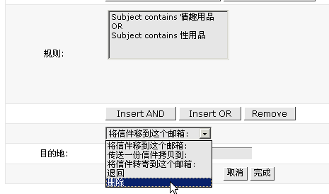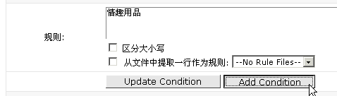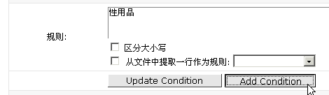 6> 填入"情趣用品"并點(diǎn)擊"Add Condition"按鈕7> 制定好規(guī)則后,進(jìn)行選擇符合規(guī)則的處理方法,我們是要?jiǎng)h除它,所以選擇"刪除"。8> 點(diǎn)擊"完成",過濾就設(shè)置好了,可以繼續(xù)添加別的過濾。