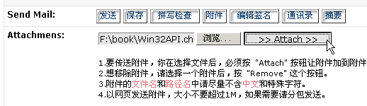 1> 登錄郵箱進(jìn)入寫郵件。2> 點(diǎn)擊"Attachmens:"后的瀏覽按鈕. 3> 這時(shí)彈出文件夾選項(xiàng)框,選擇需要發(fā)送的文件。4> 點(diǎn)擊"Attach"按鈕進(jìn)行粘貼。5> 粘貼完后應(yīng)該顯示在如下框里。6、輸入對(duì)方郵件地址和正文后點(diǎn)擊"發(fā)送"即可。